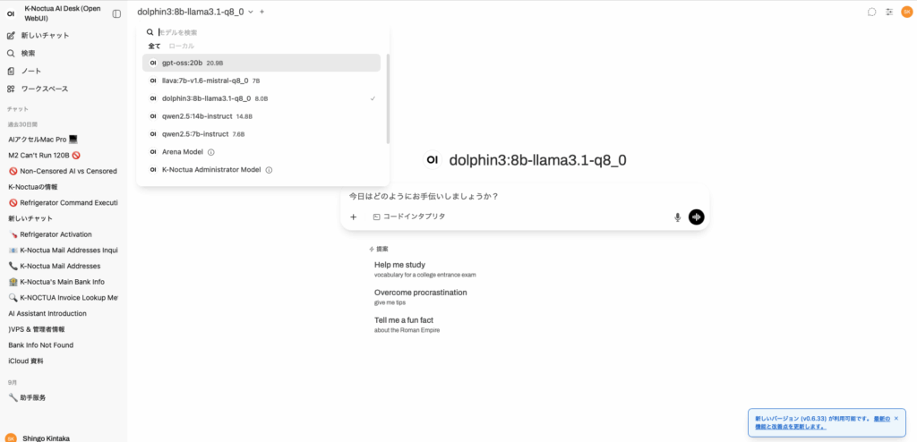 - 完全ローカル推論:AppleシリコンMacに Ollama と Open WebUI、用途別モデル(Qwen/LLaVA/gpt‑oss/Dolphin3は管理者のみ)を導入。